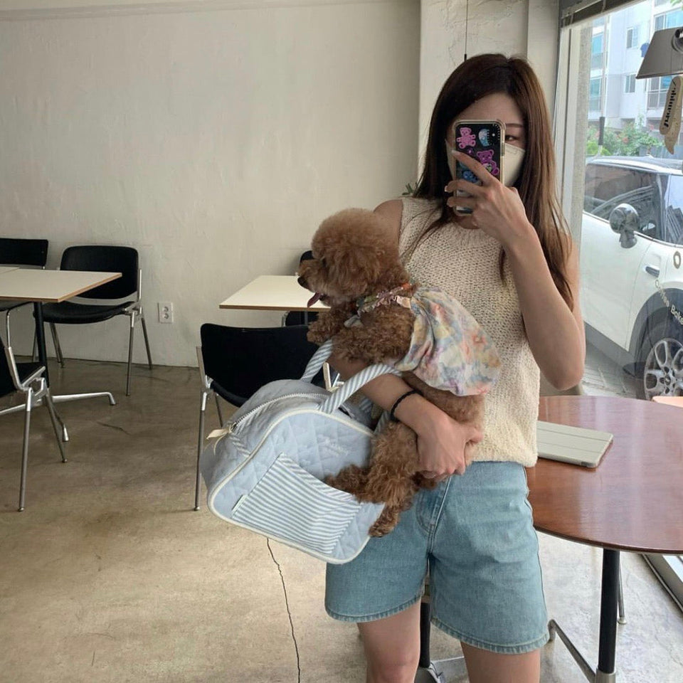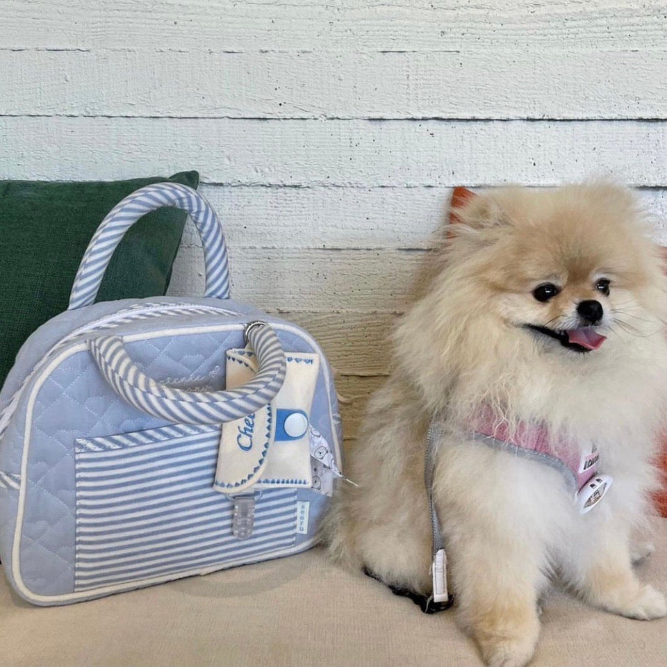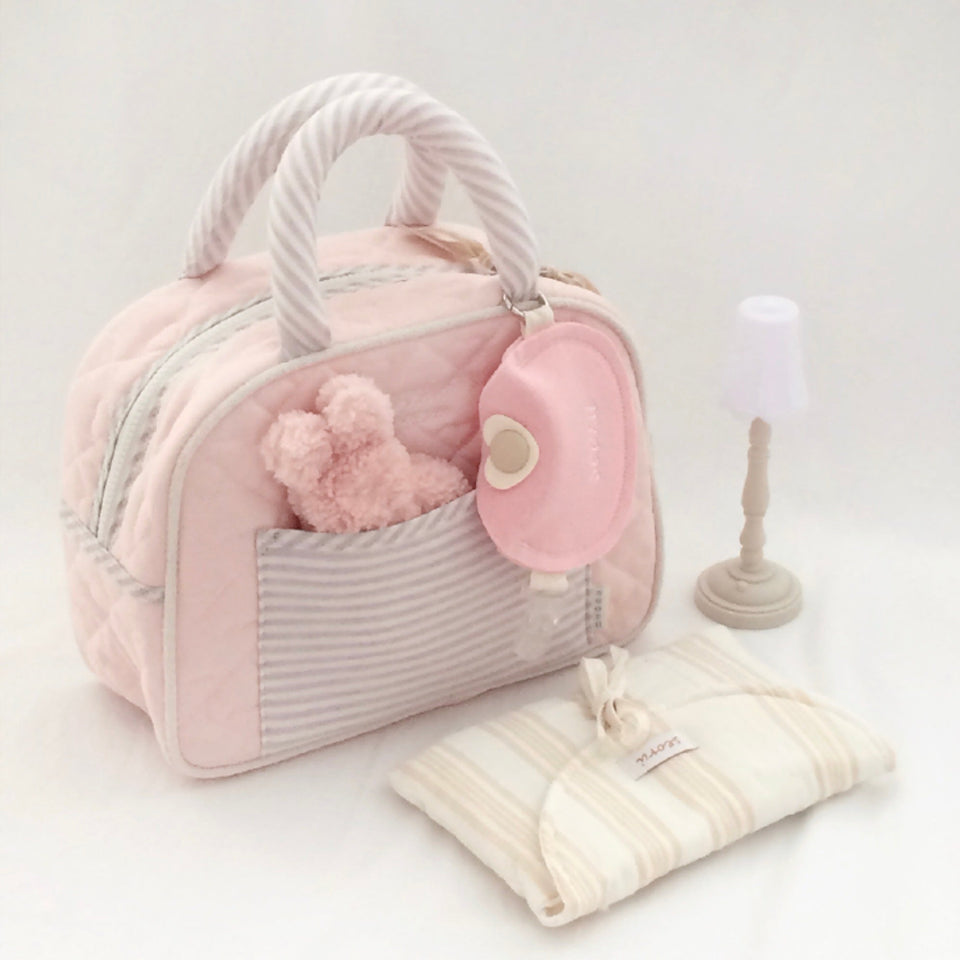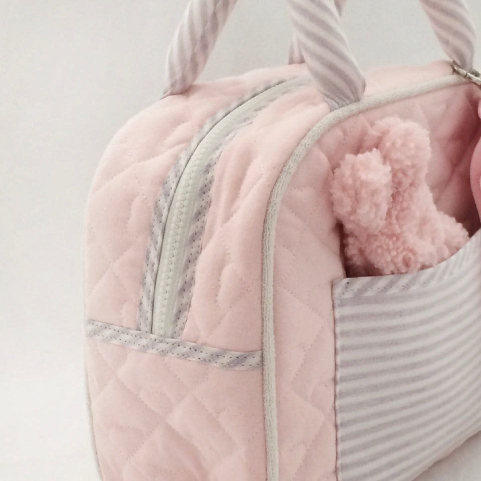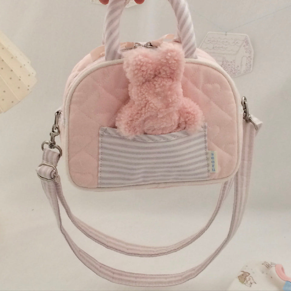 コットン100%のseoruらしいヴィンテージキルティング生地にポケットやハンドル、ストラップにチェックやストライプをあわせたseoruらしいデザインのお散歩バッグ!