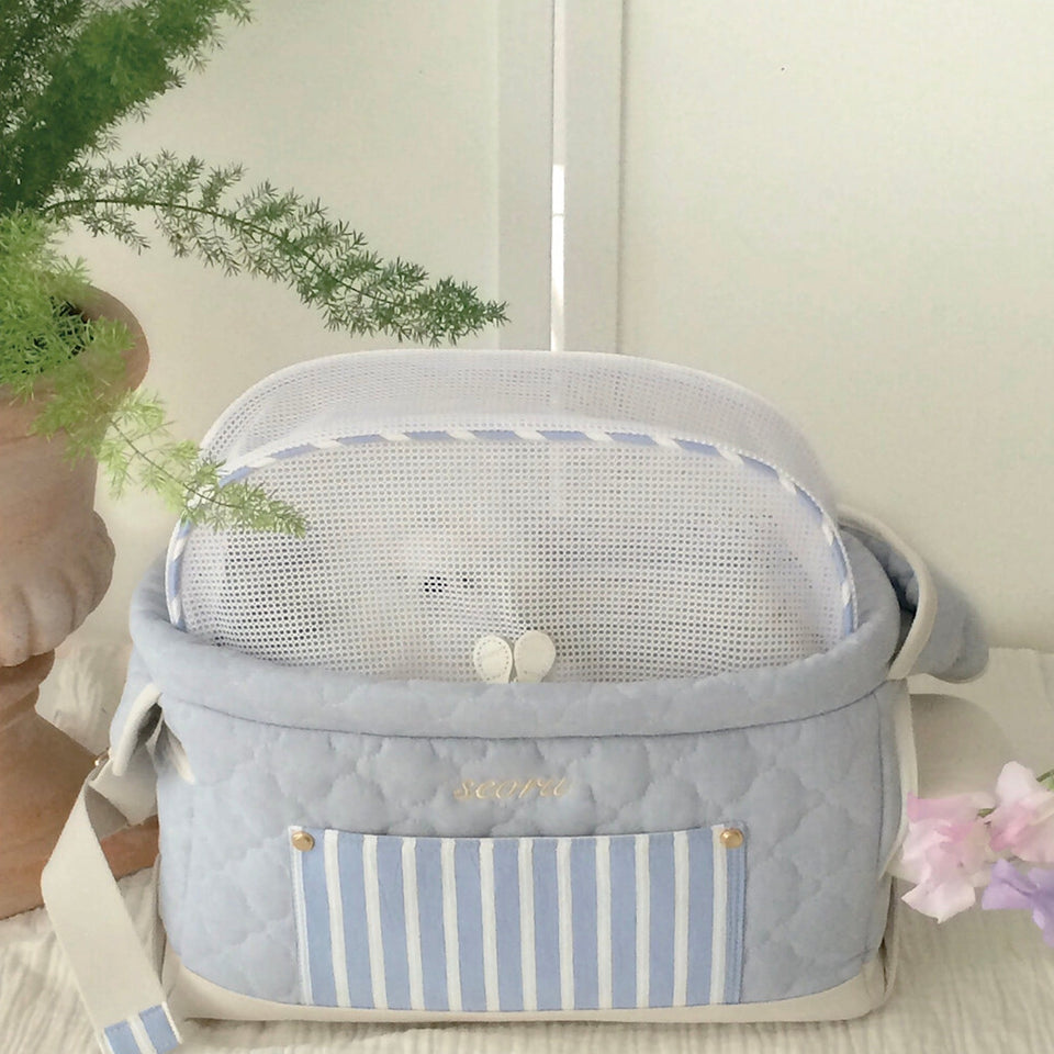 定番のスリングとの違いは、スクエア型でより安定感を持たせた形に常設でつけられた上部メッシュと日本製の高級ストライプ生地を使用したモデル!