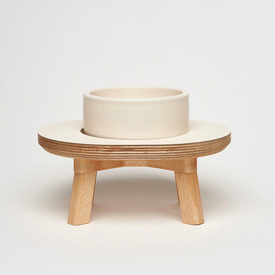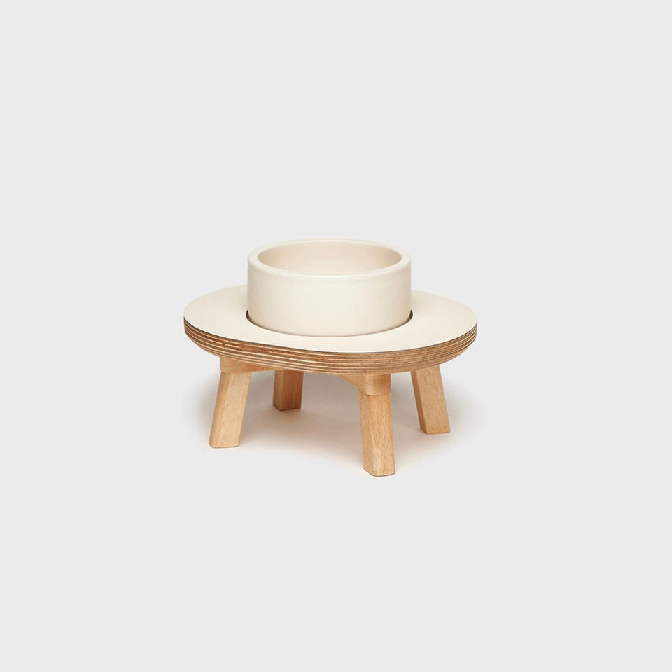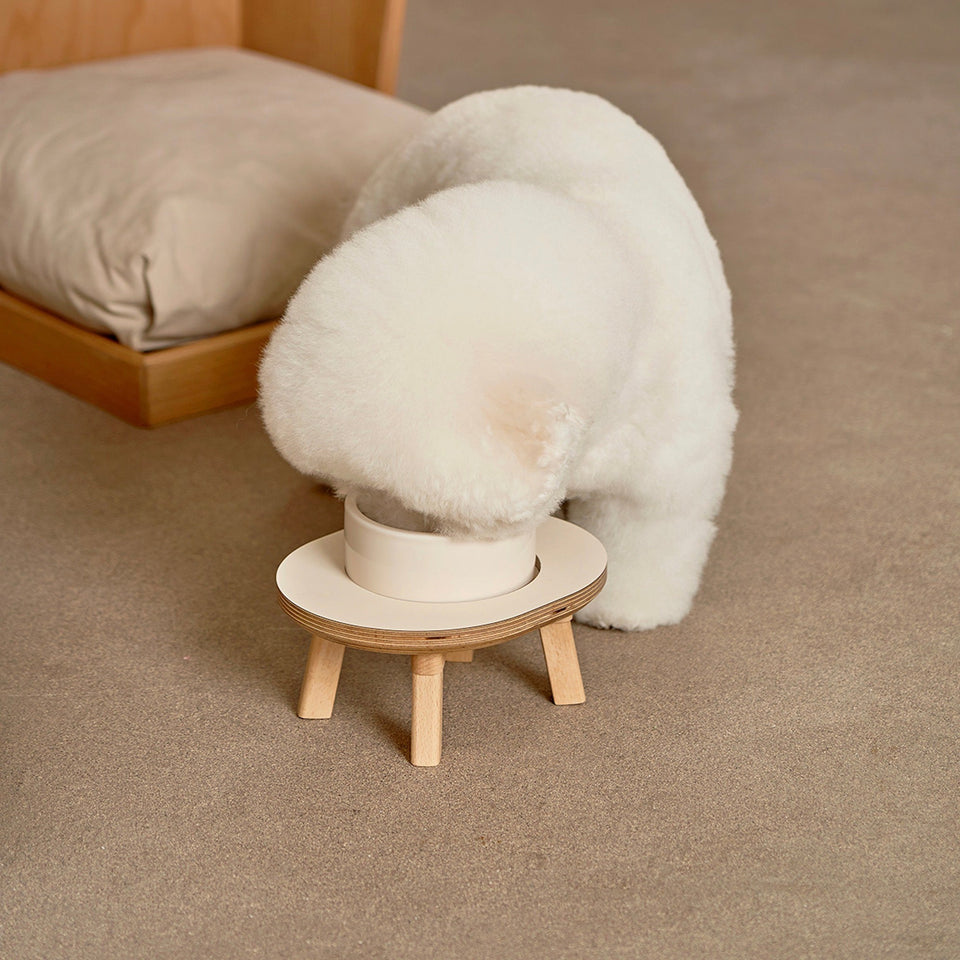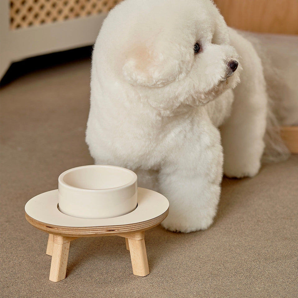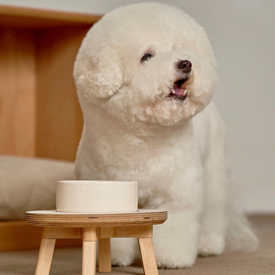 傷や熱にも強く、抗菌性も抜群な全体的に厚みのある円形で、ワンちゃんがご飯を食べても器が動かないように適度な重量感をプラスしているセラミック素材のPLAIN BOWLと、クリーンタッチ天板と原木で作られたダイニングテーブルの1Pセット!