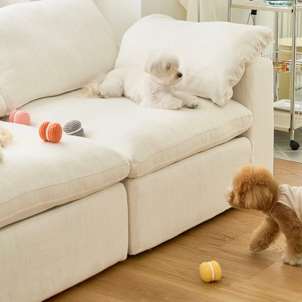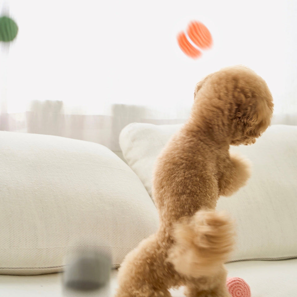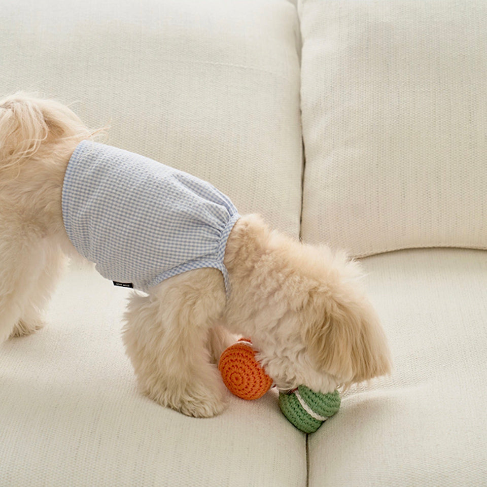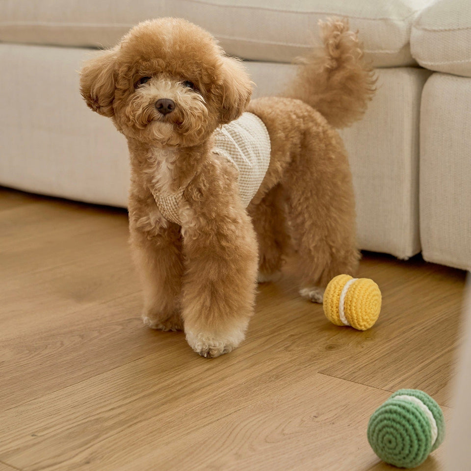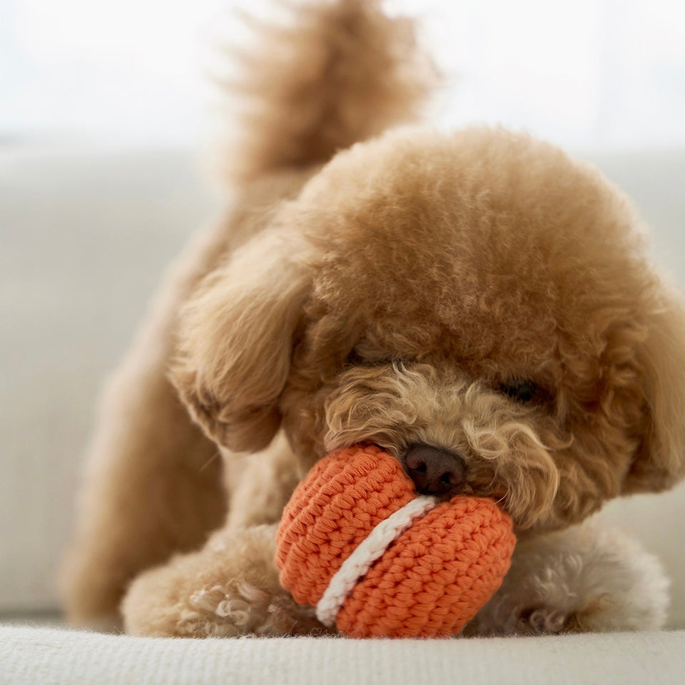 100%環境に優しいプレミアムコットン で作られたマカロントイは愛犬の毛や埃が付きにくいため清潔で、安心して愛犬が口に咥えることができます。