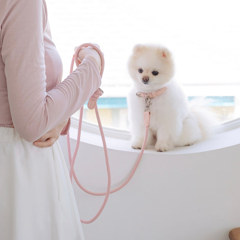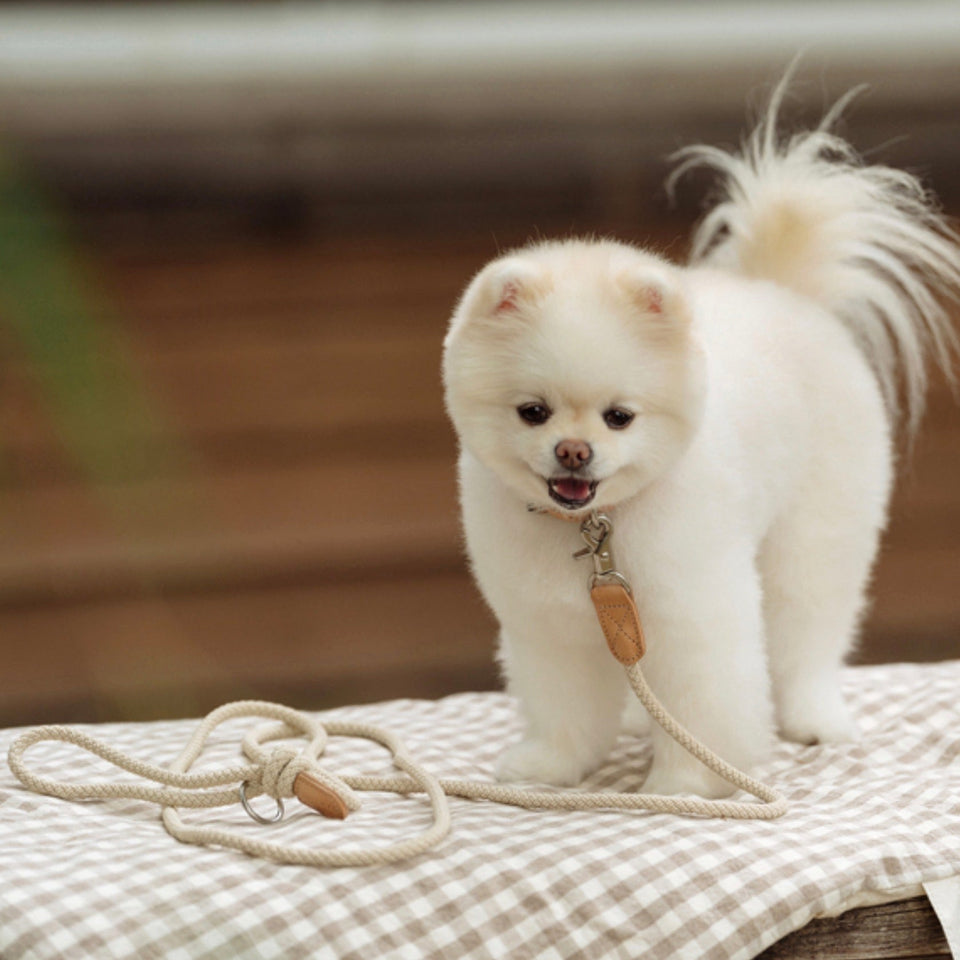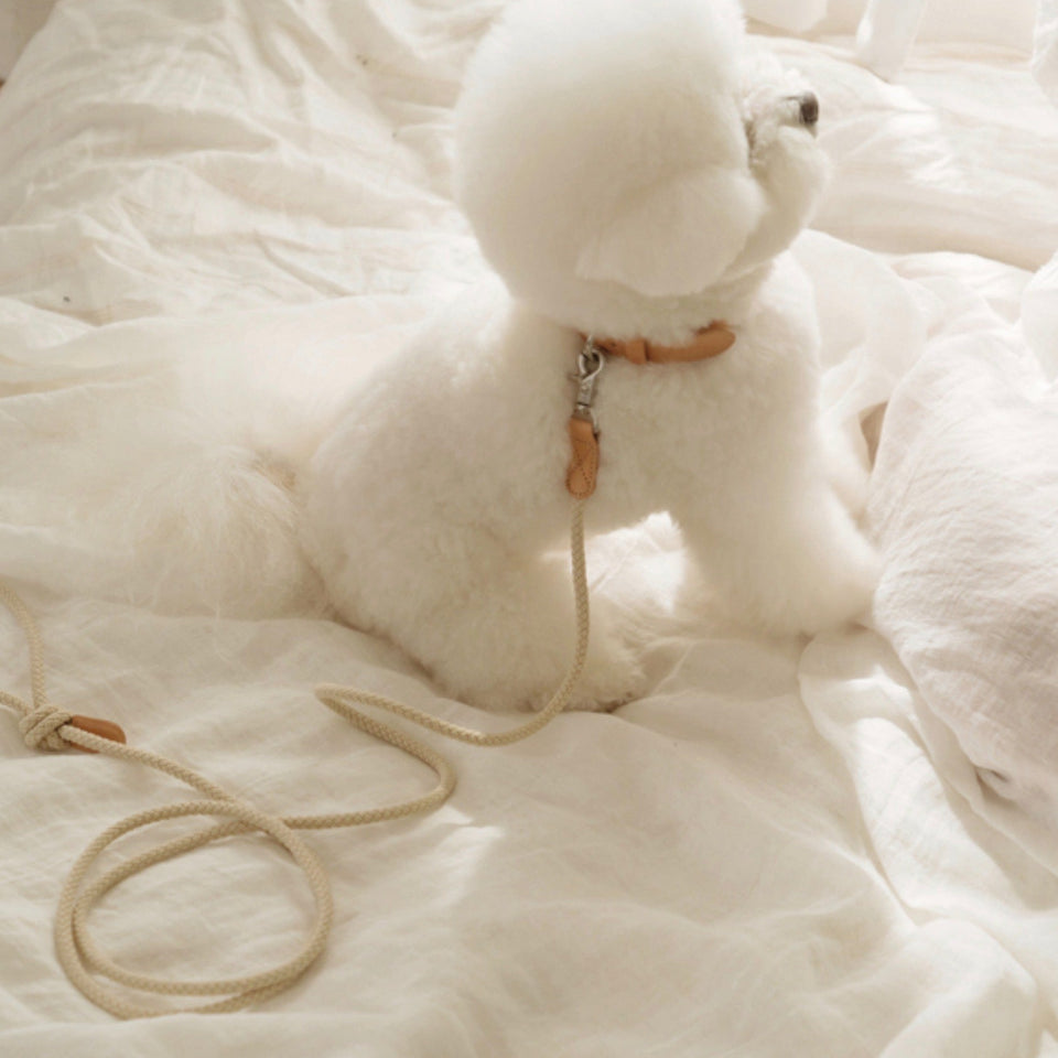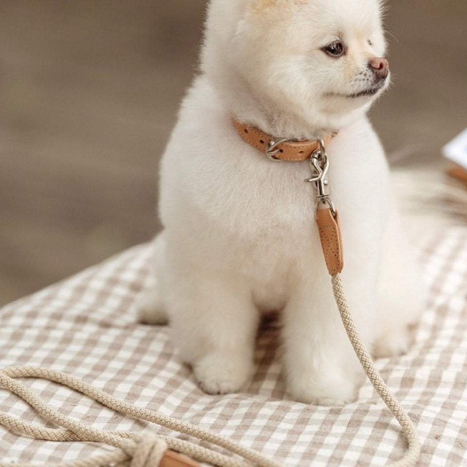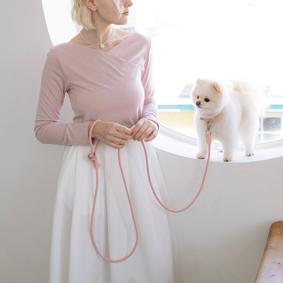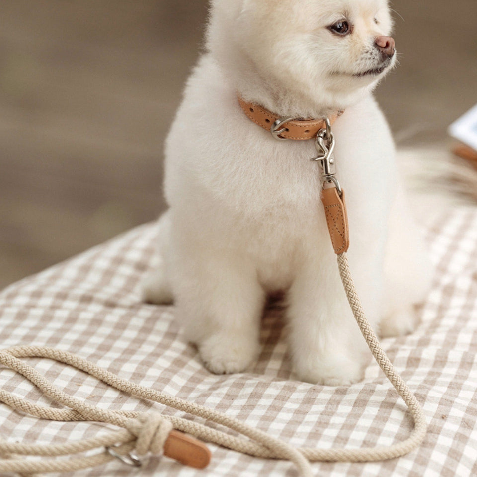 『優しい色味が特徴の天然革のレザーとロープの組み合わせがおしゃれな細めのリーシュ』