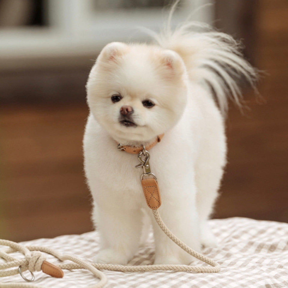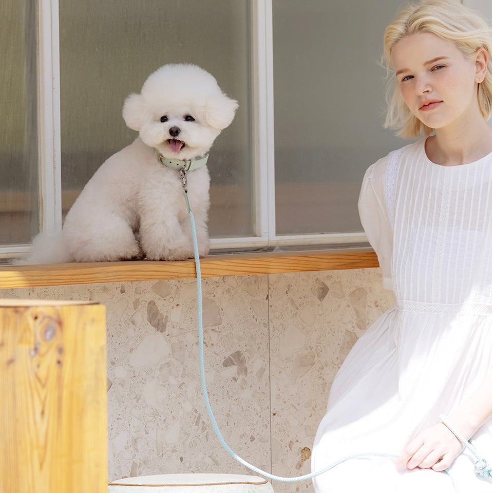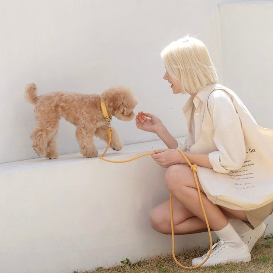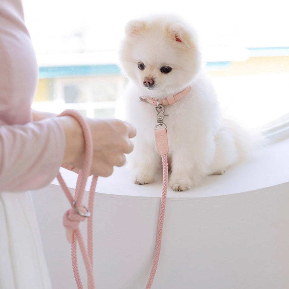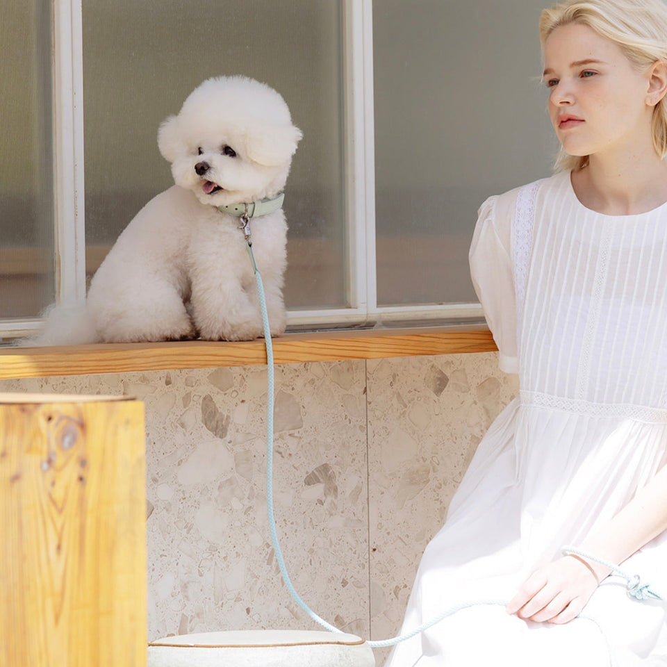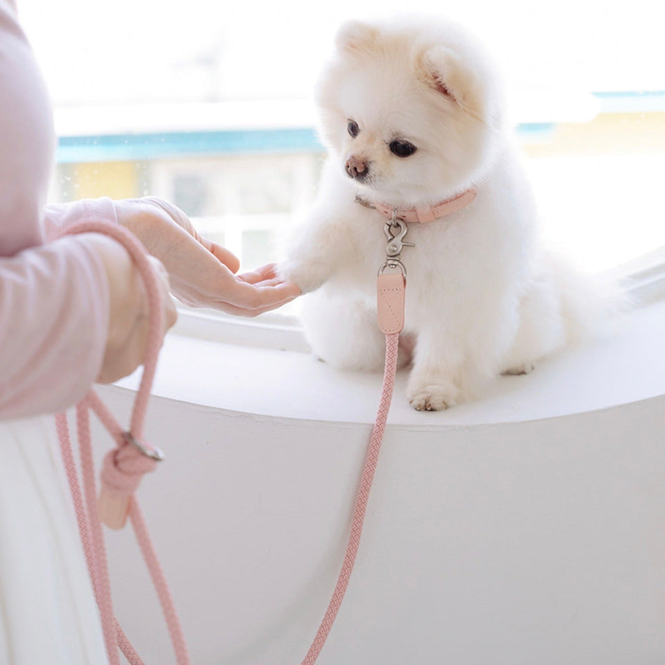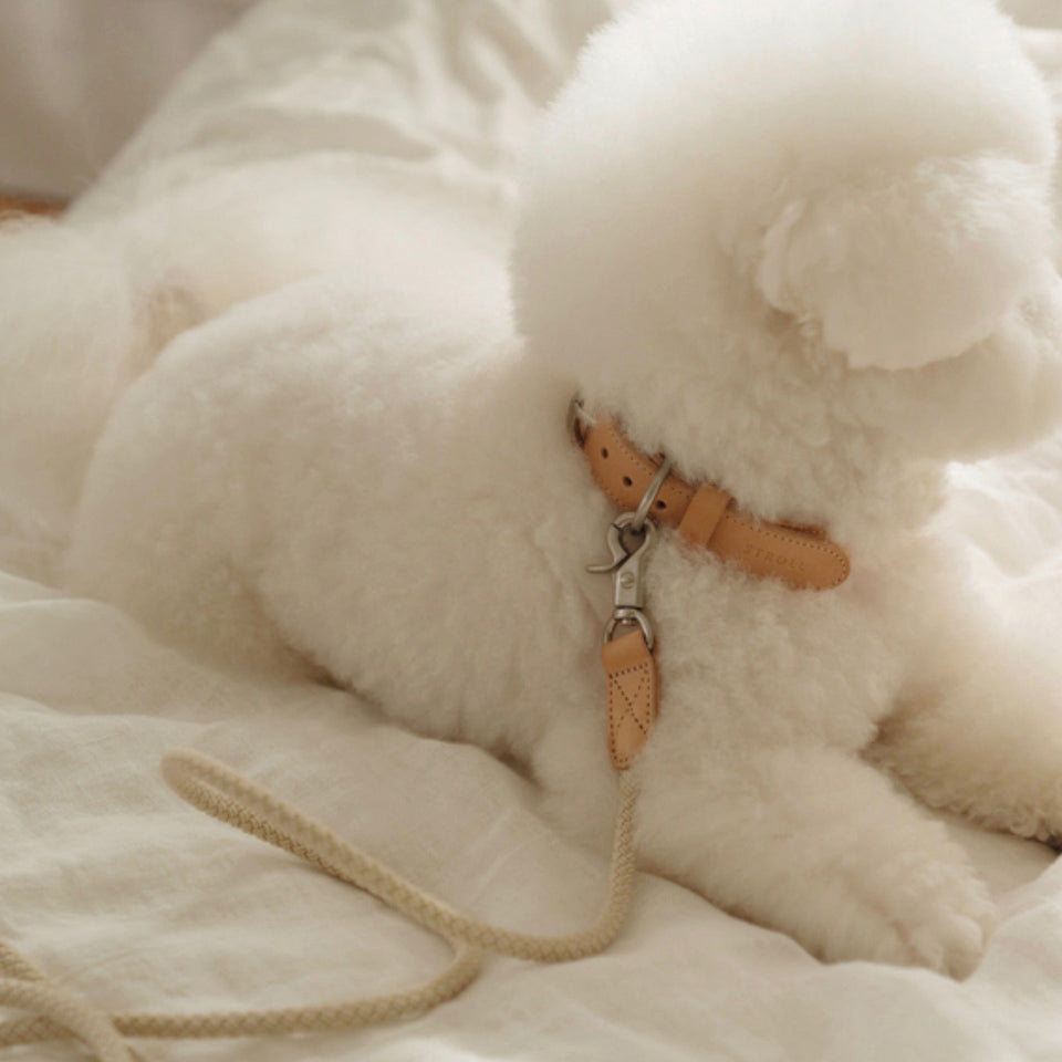 『優しい色味が特徴の天然革のレザーとロープの組み合わせがおしゃれな細めのリーシュ』