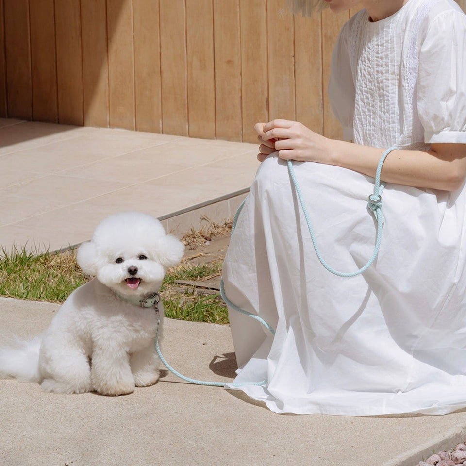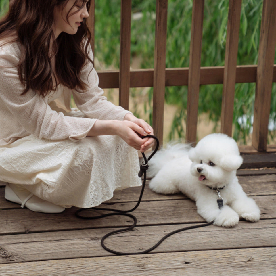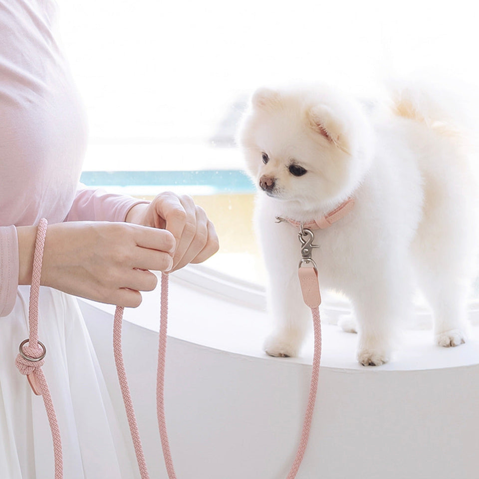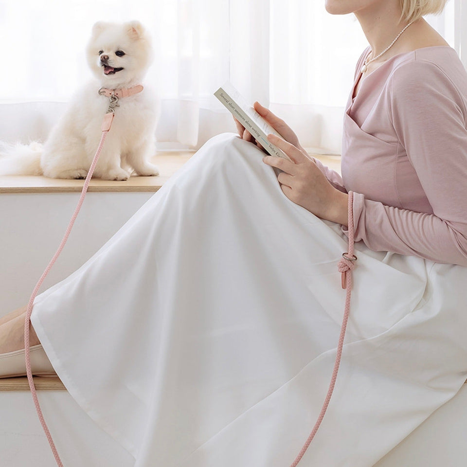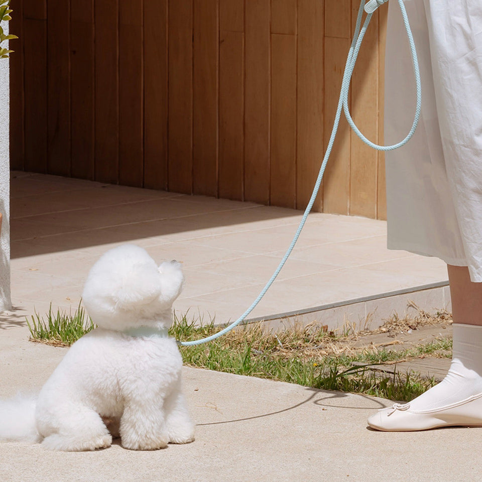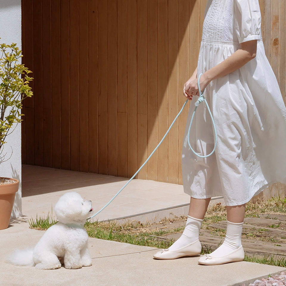『優しい色味が特徴の天然革のレザーとロープの組み合わせがおしゃれな細めのリーシュ』