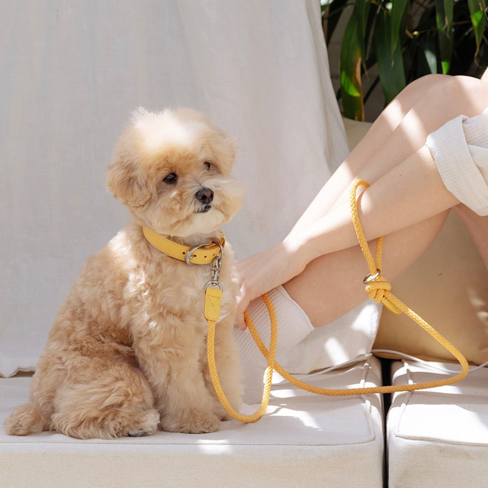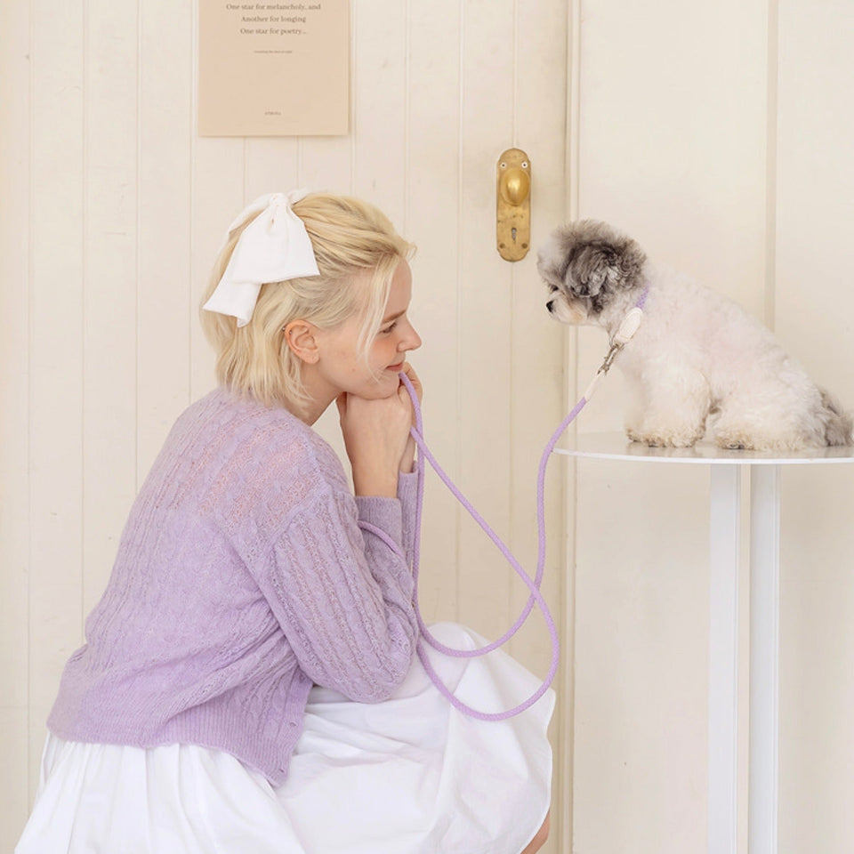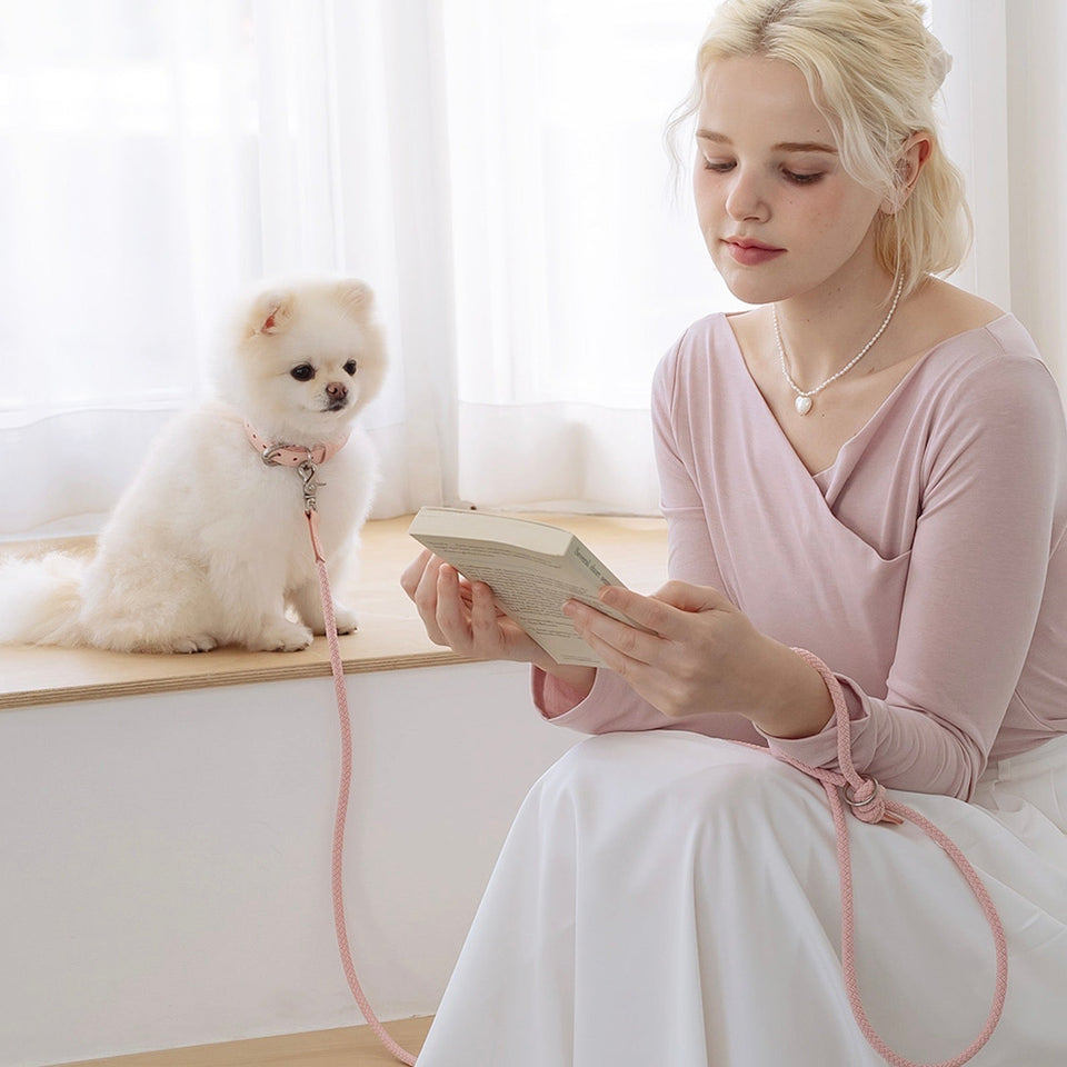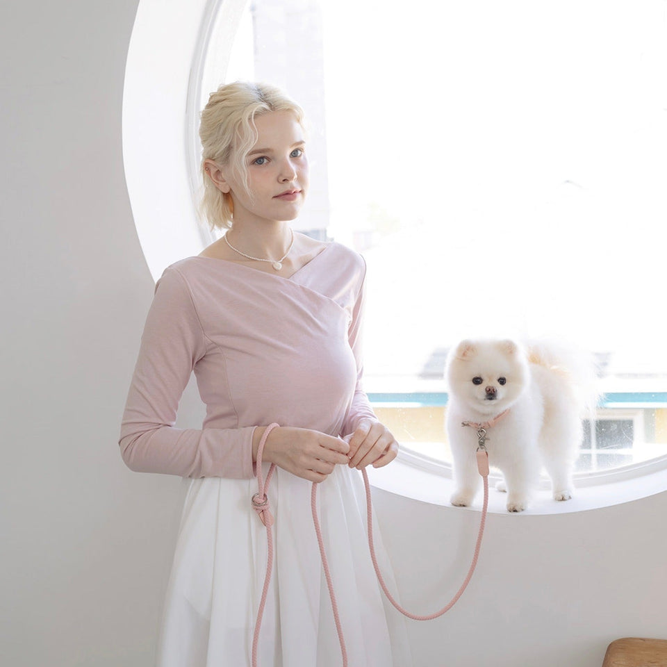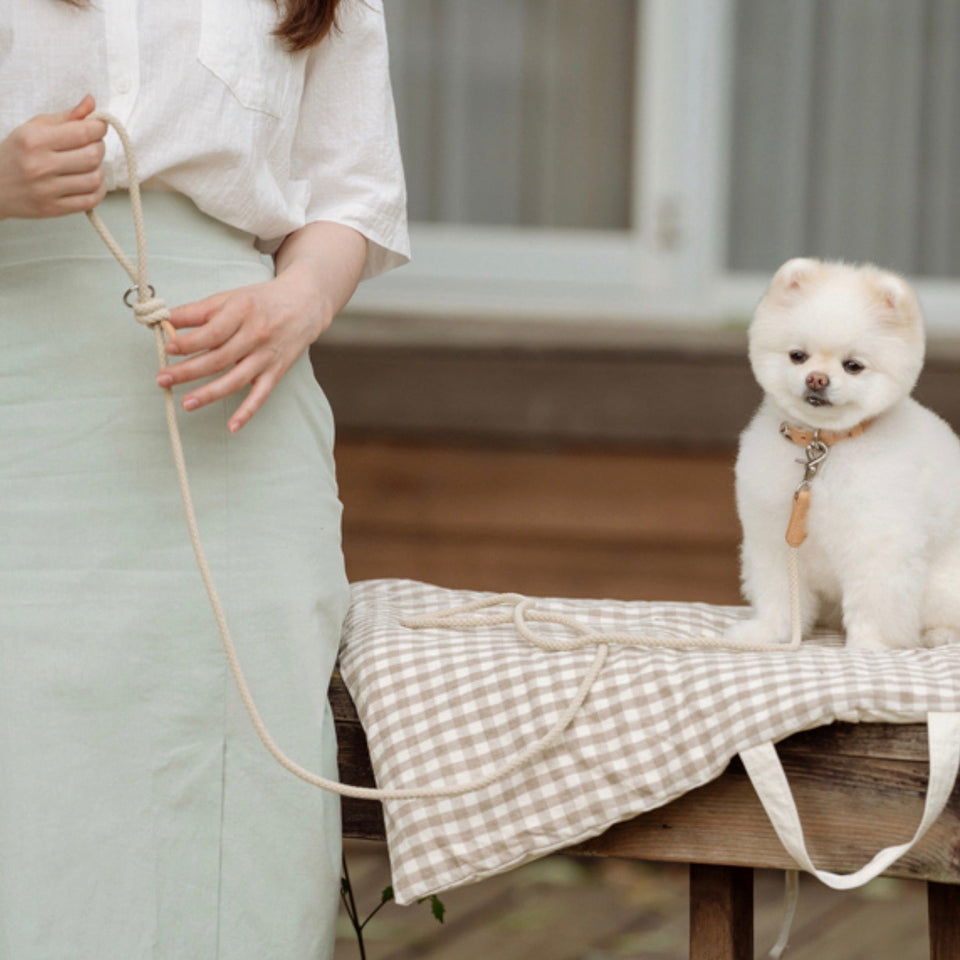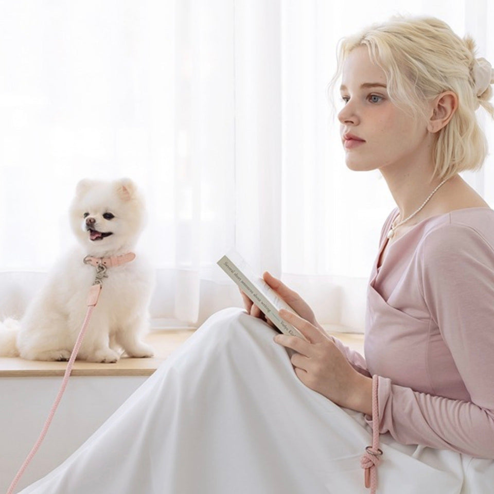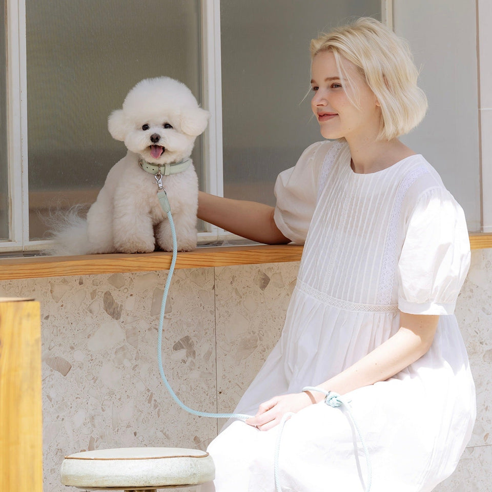 『優しい色味が特徴の天然革のレザーとロープの組み合わせがおしゃれな細めのリーシュ』
