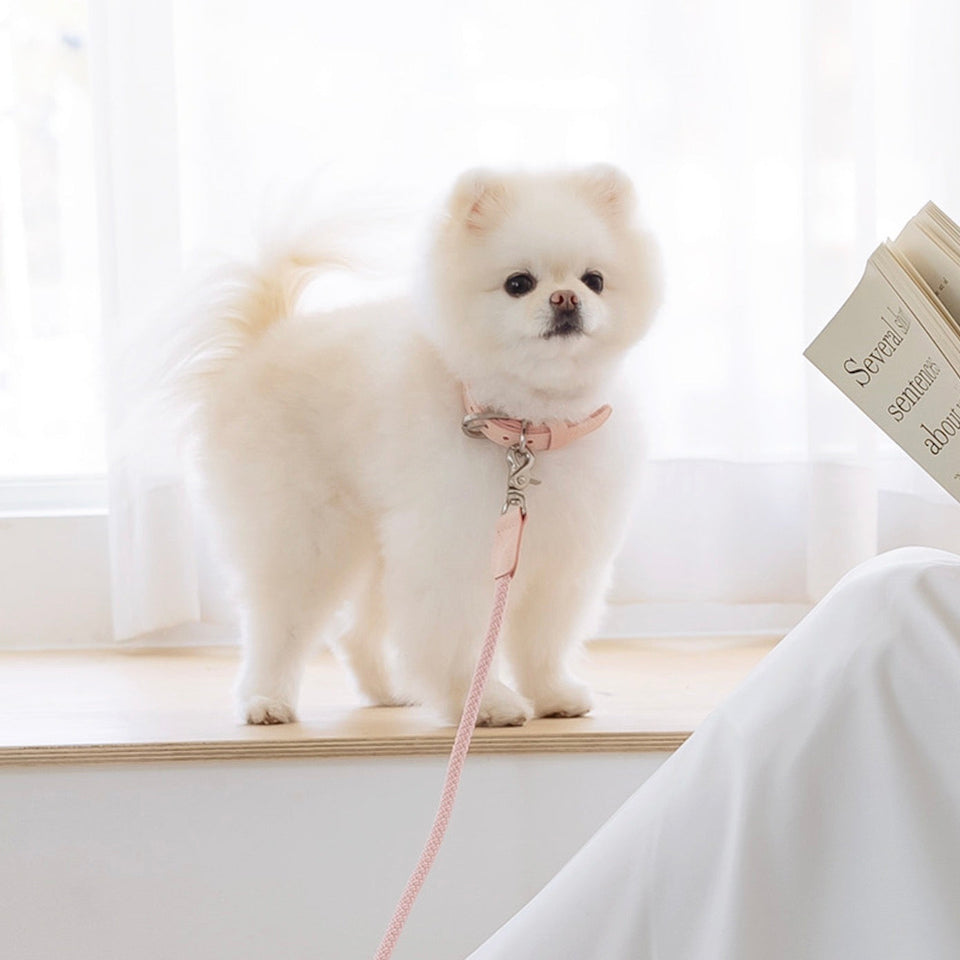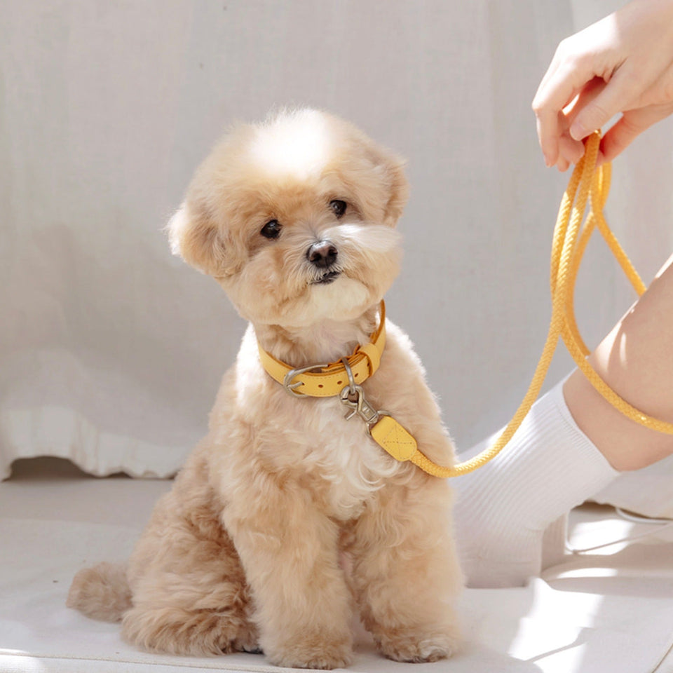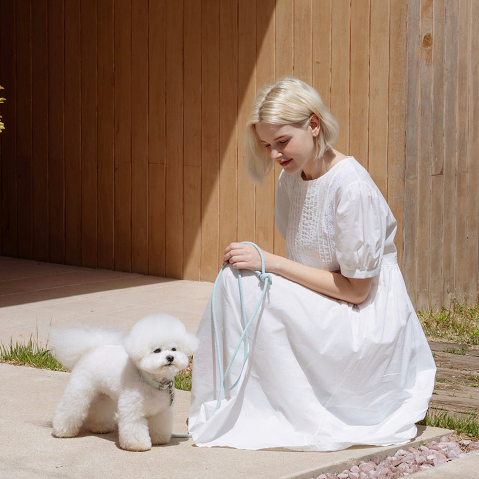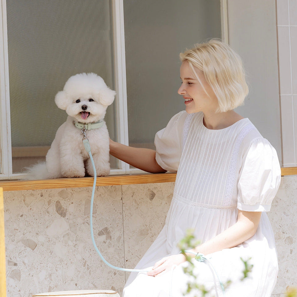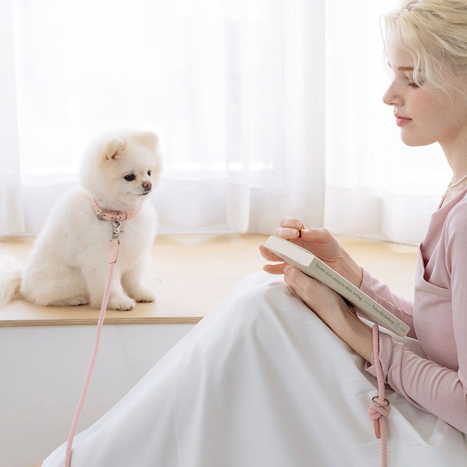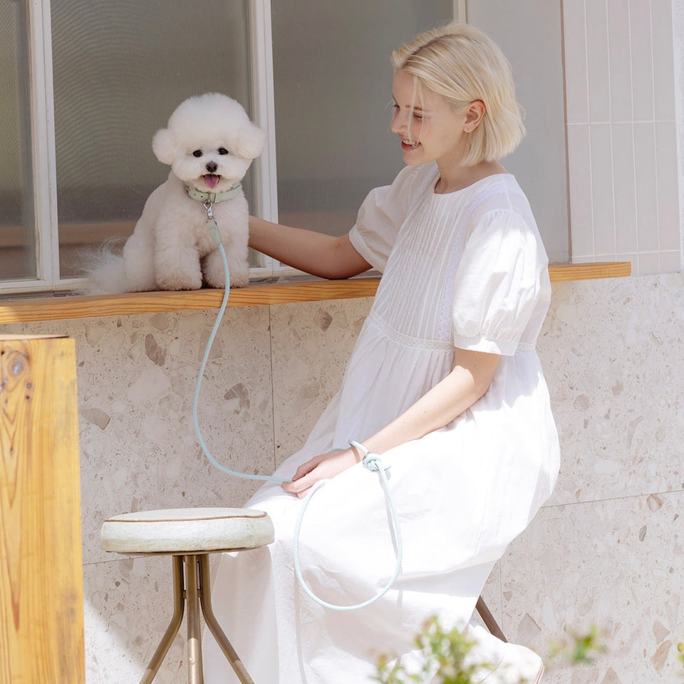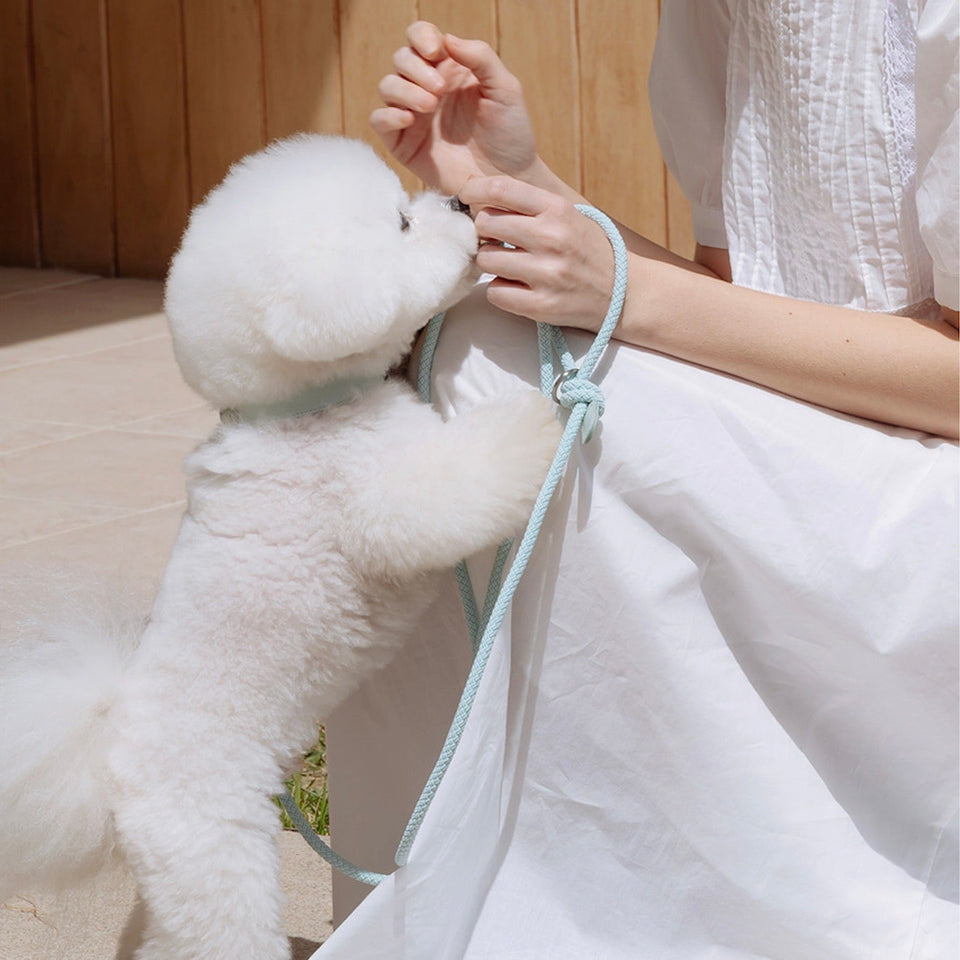 『優しい色味が特徴の天然革のレザーとロープの組み合わせがおしゃれな細めのリーシュ』