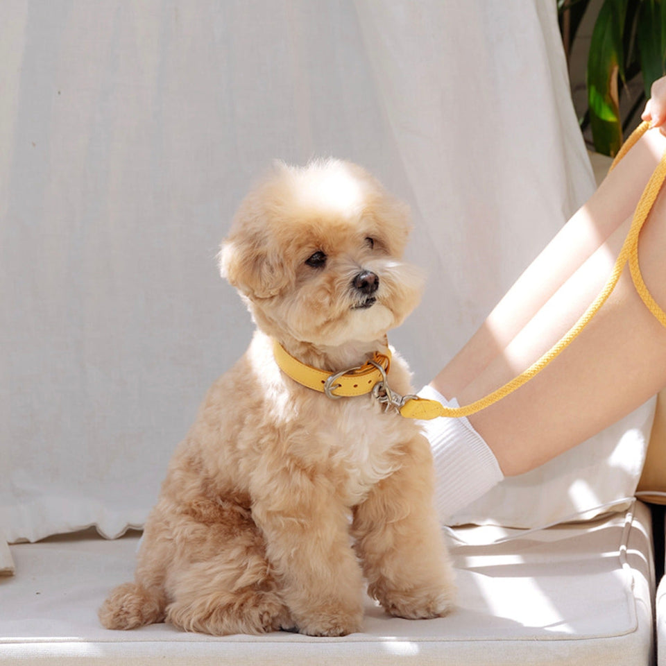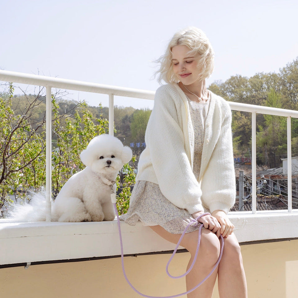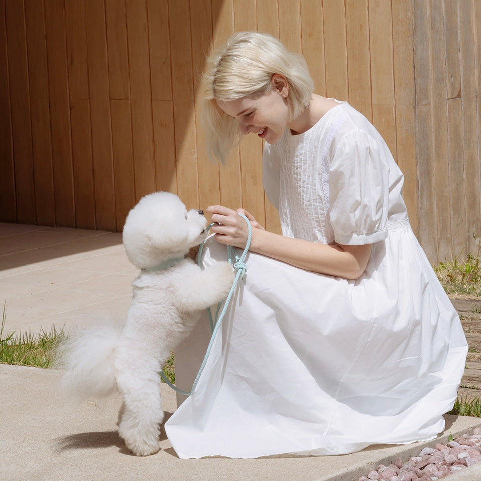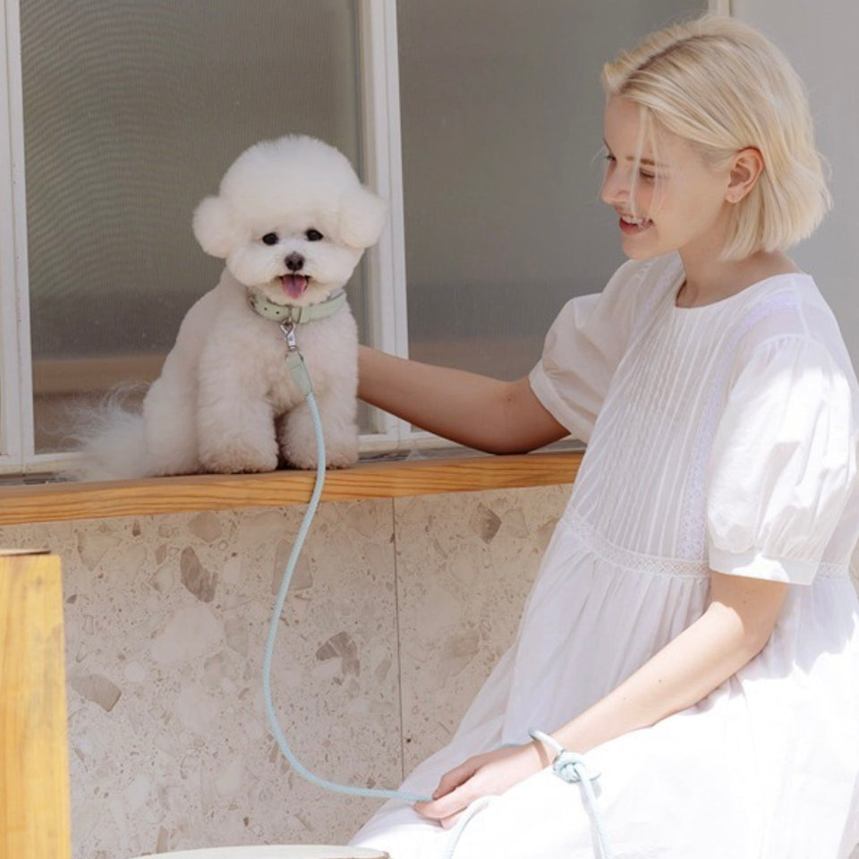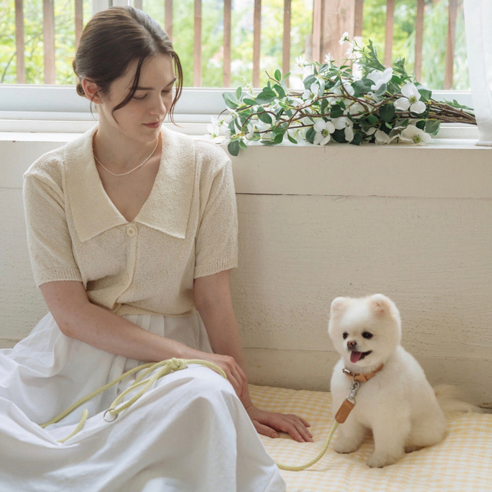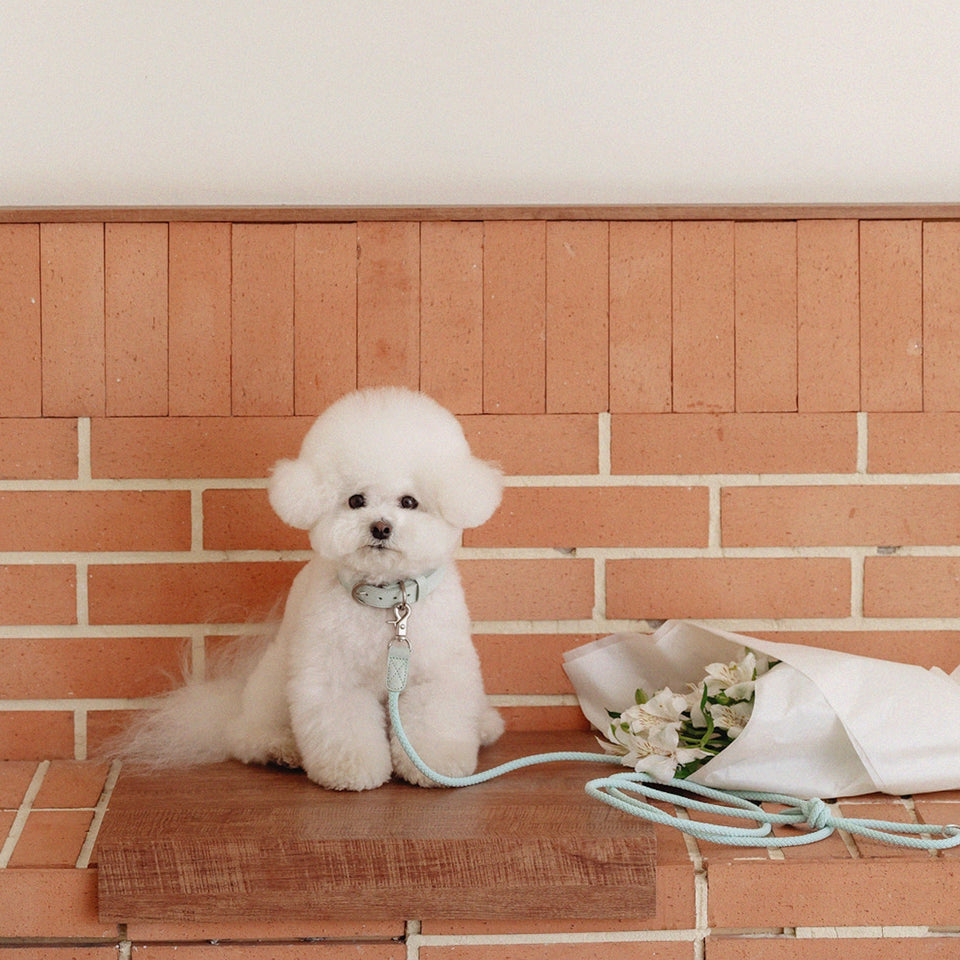 『優しい色味が特徴の天然革のレザーとロープの組み合わせがおしゃれな細めのリーシュ』